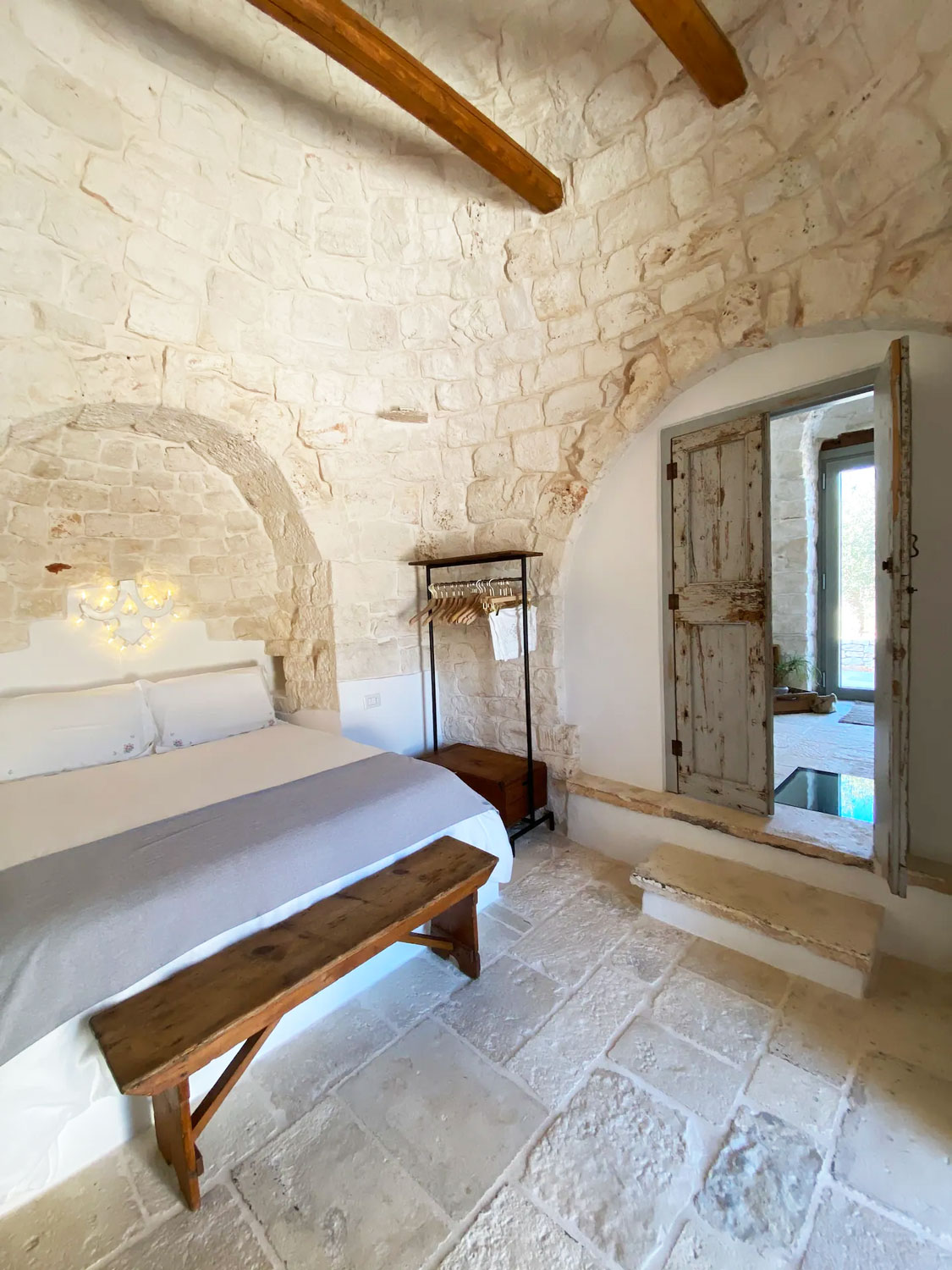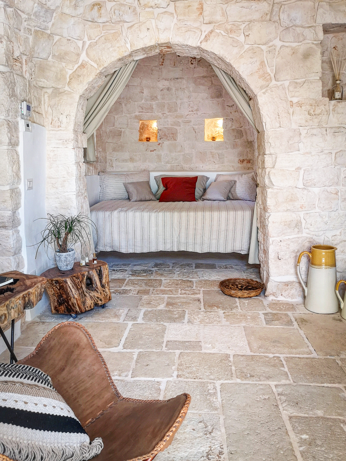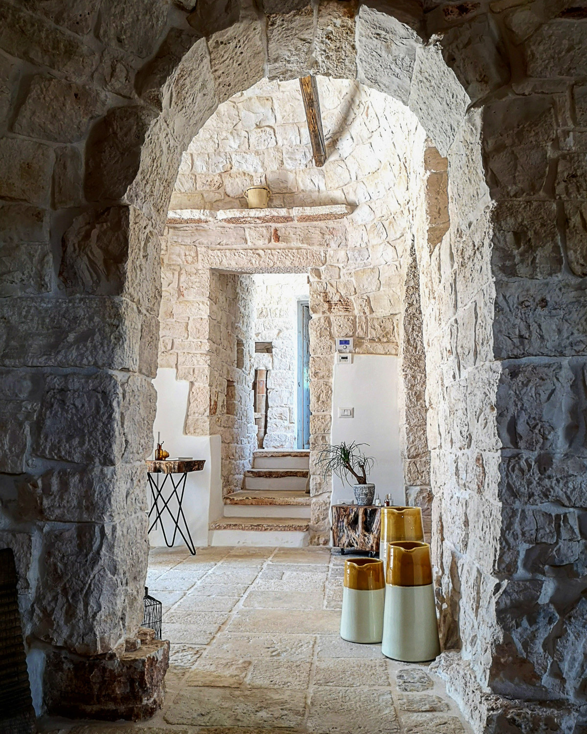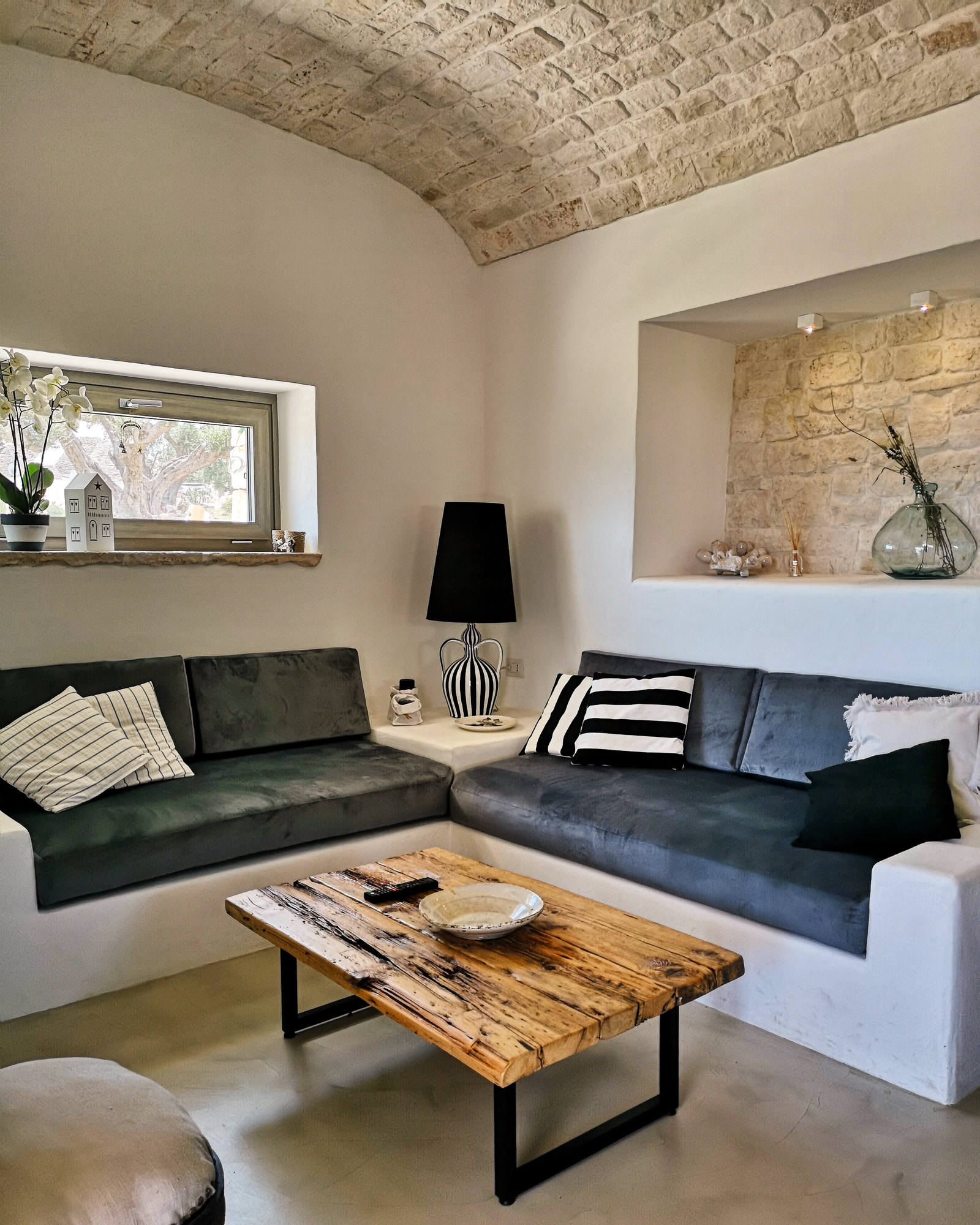 Ogni singola pietra diventa parte di un racconto contemporaneo, il recupero e l’attenzione al design diventano fondamentali per unire passato e presente. Gli interni, elegantemente restaurati, fondono manufatti antichi con elementi contemporanei. L’atmosfera accogliente si sposa con il comfort moderno, trasformando il trullo in un’oasi di eleganza senza tempo.
