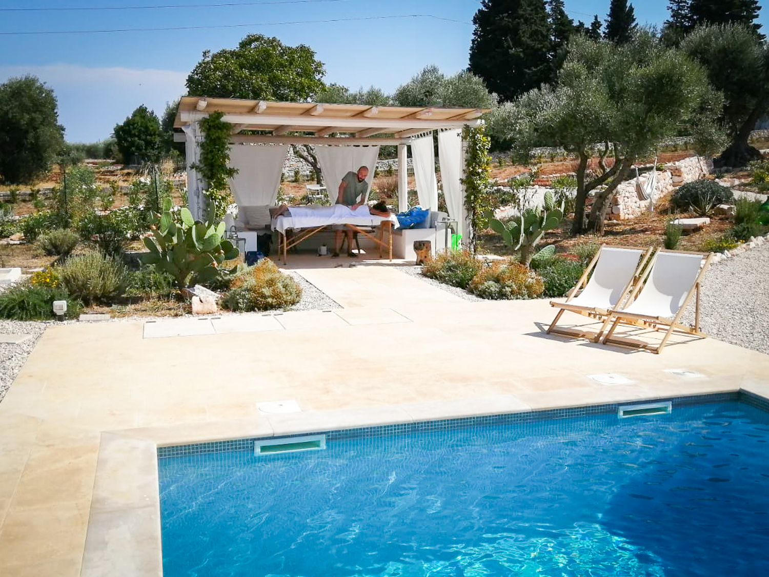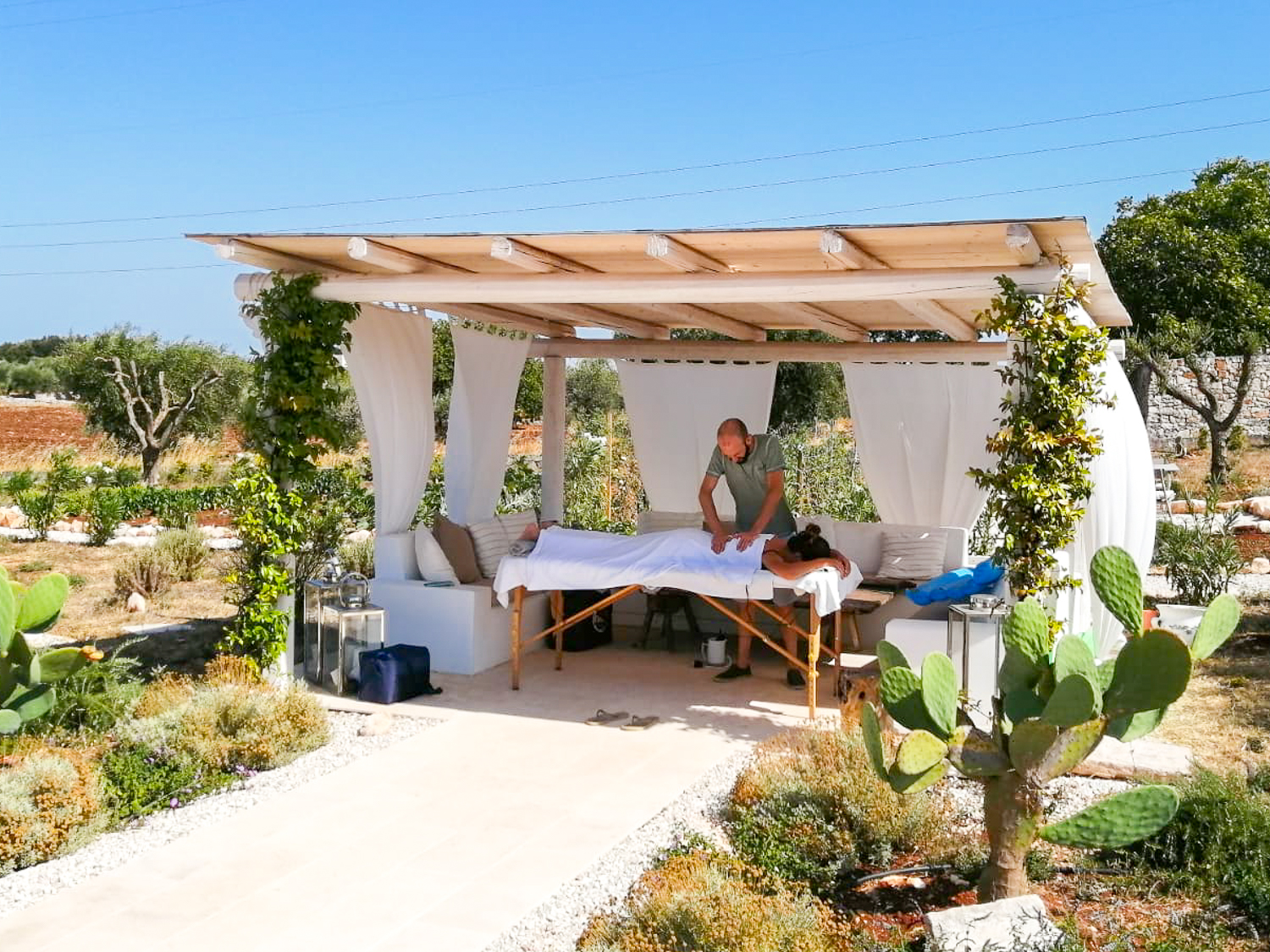 Il canto delle cicale tra gli ulivi centenari, il sole che disegna ombre in una calda giornata pugliese. Le mani esperte del massaggiatore danzano leggere, sciogliendo ogni tensione e avvolgendo il corpo in un abbraccio rilassante.